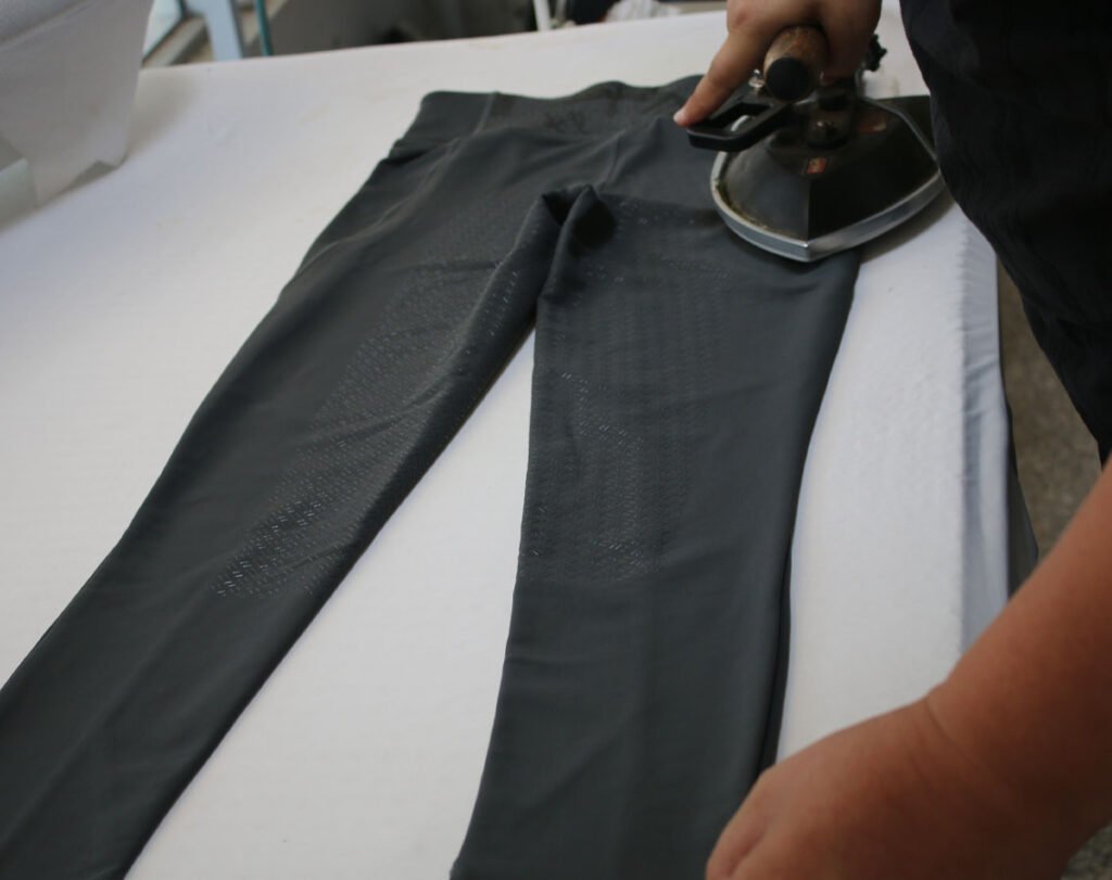Careful pressing shapes the garment’s structure and ensures a refined final appearance.